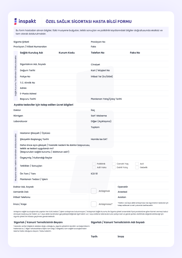 Bu form, özel sağlık sigortası kapsamında hastaların adı, soyadı, iletişim bilgileri ve sigorta detayları gibi bilgilerini toplamak amacıyla kullanılır. Sağlık hizmetleri sırasında sigorta işlemlerini kolaylaştırır.