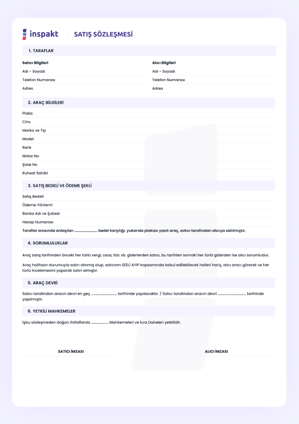 Araç alım-satım işlemlerinde tarafların haklarını, sorumluluklarını ve anlaşma detaylarını belirlemek için kullanılan bir sözleşmedir.
